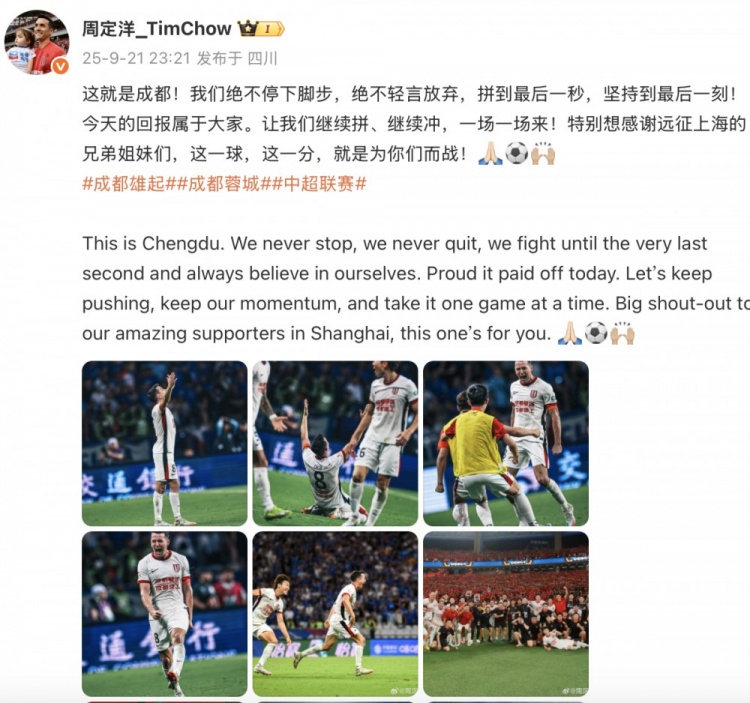 9月21日讯 帮助蓉城绝平申花后,周定洋更新社媒,庆祝这场重要的平局。