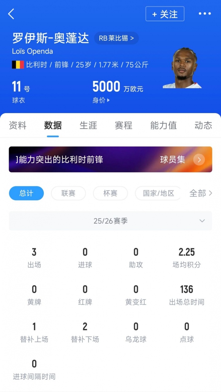25岁的奥蓬达司职前锋,上赛季为莱比锡各项赛事45场13球7助攻,德转身价5000万欧元。