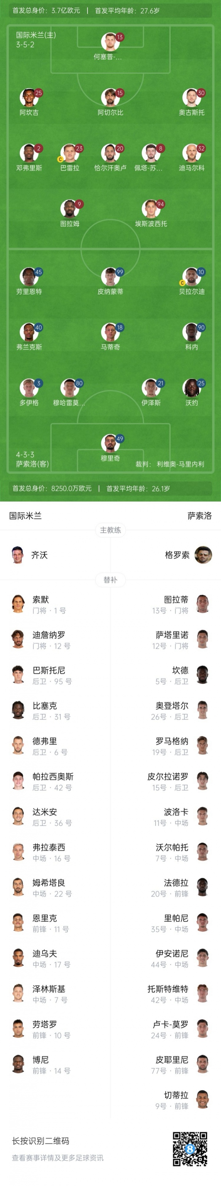 9月22日讯 意甲第4轮,国际米兰主场迎战萨索洛,赛前首发名单公布。