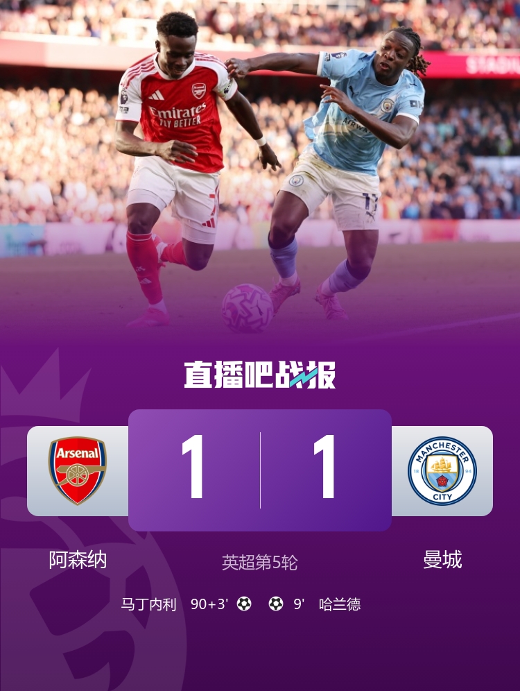 哈兰德单刀破门+失良机,马丁内利补时吊射建功;阿森纳重回第2距榜首5分,曼城近4轮1胜1平2负。