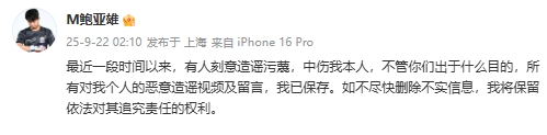 09月22日讯 今天凌晨2点,申花门将鲍亚雄突然在社媒发文,表示近期有人对自己刻意造谣污蔑,将保留依法对其追究责任的权利。