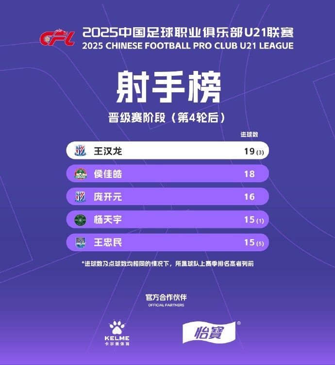 射手榜方面,上海申花U21球员王汉龙以19粒进球排名第一,浙江队U21球员侯佳皓以18球排名第二。