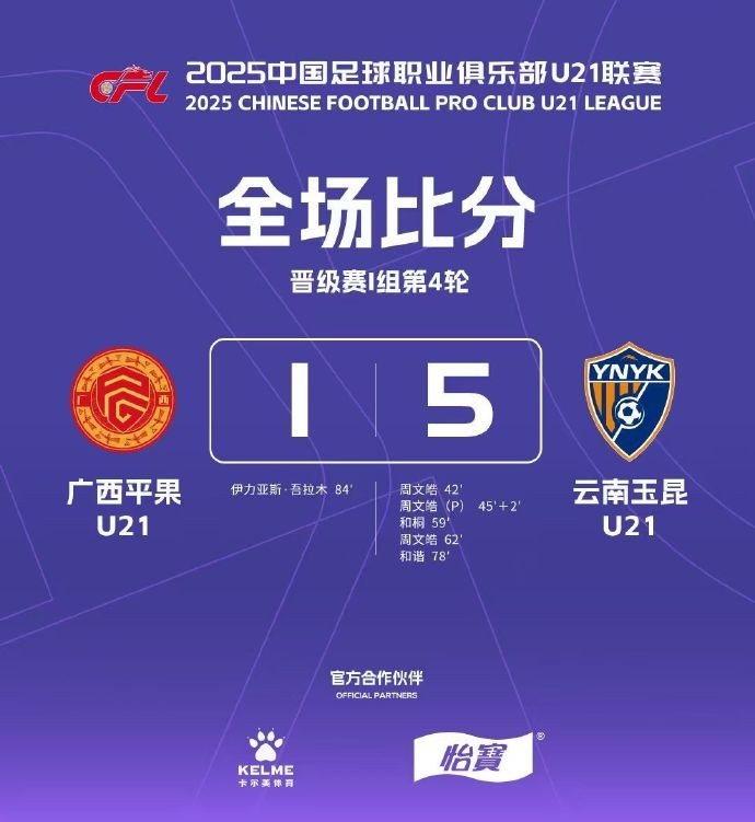 9月22日讯 2025中国足球青少年精英联赛(U21组)晋级赛I组第4轮,上海申花4-0战胜长春亚泰,广西平果1-5不敌云南玉昆,梅州客家1-4不敌昆明城星,大连英博5-0大胜青岛西海岸。