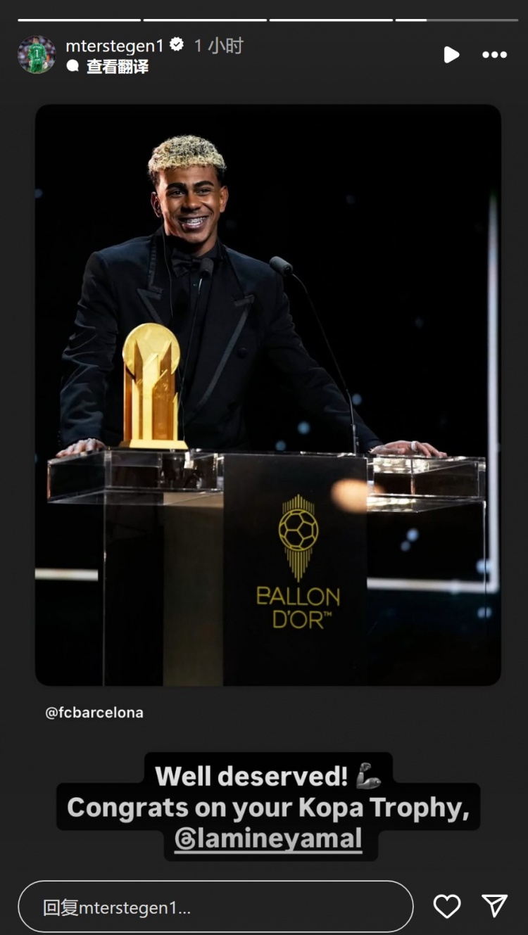 特尔施特根还晒出亚马尔领奖的照片:“实至名归,祝贺你获得科帕奖。”