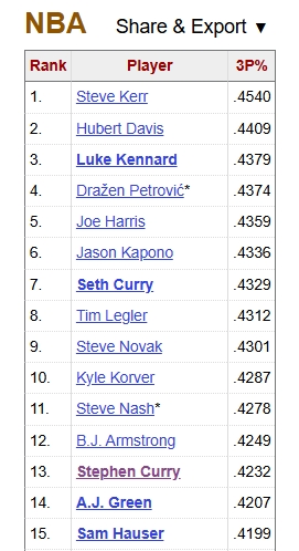区区斯蒂芬😁小库里三分命中率是NBA历史第7!他哥仅排第13