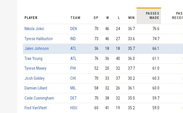 上赛季常规赛期间场均传球次数范弗里特队内第一、联盟第9