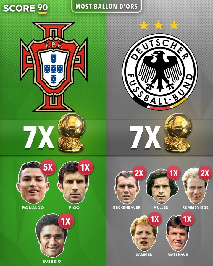 3.葡萄牙 7次(C罗x5 菲戈、尤西比奥x1)