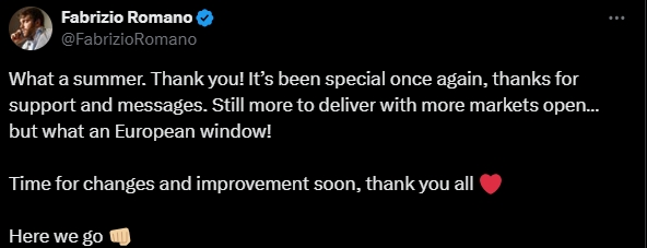冬窗再见!夏窗正式关窗,罗马诺感谢球迷:难忘的夏天,谢谢大家