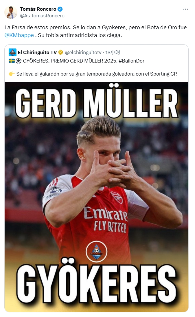 龙赛罗在自己的一条社媒中写道:“这些奖项简直是闹剧。他们把这项奖(盖德-穆勒奖)颁给了约克雷斯,(欧洲)金靴奖却颁给了姆巴佩。他们的反皇马恐惧症蒙蔽了他们的双眼。