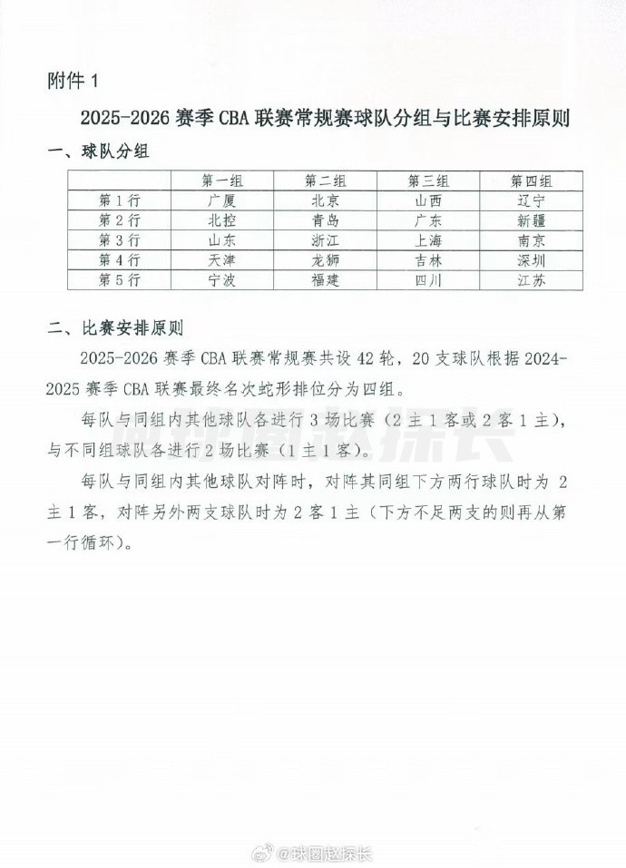 原文写道:“据探长了解,CBA公司已将新赛季初版赛程发至各队征求意见。球队分组以及比赛安排原则如下,某一行球队比其向下两行球队多一个主场。举个例子,在竞争非常激烈的第三组,当山西对广东时,是2主1客,而当山西对四川时,是2客1主。”