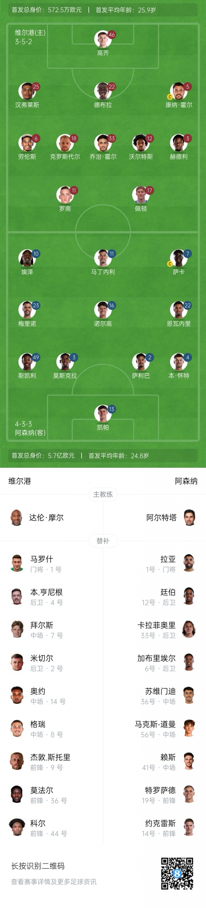 维尔港首发:46-乔·高齐、22-德布拉、25-汉弗莱斯、5-康纳·霍尔、3-赫德利、6-乔丹·加布里埃尔、12-沃尔特斯、18-克罗斯代尔、33-乔治·霍尔、11-罗南-柯蒂斯、17-佩顿