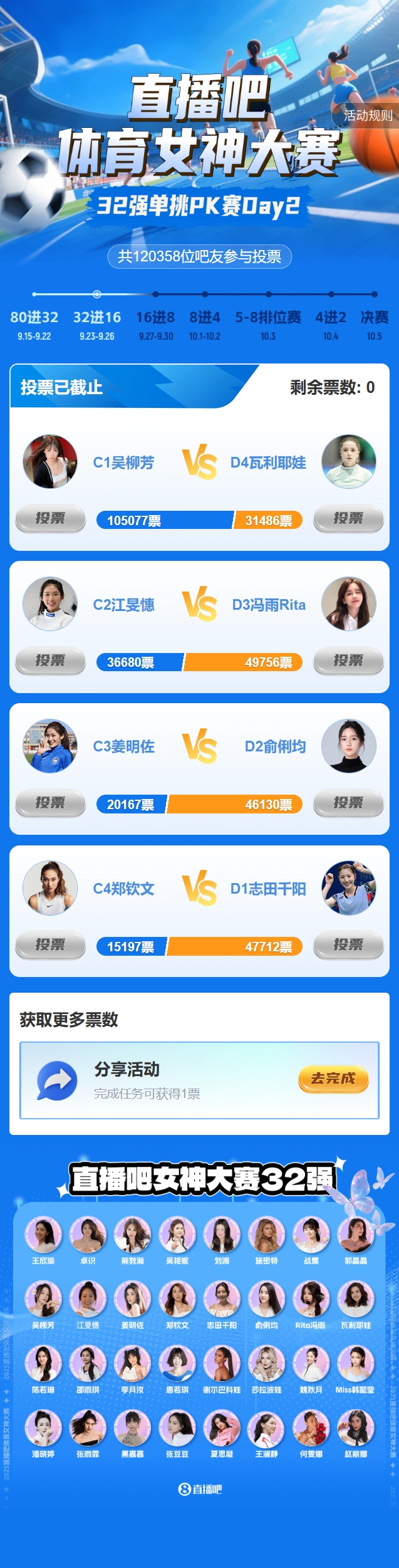 2025年『体育女神大赛』昨日进入32强单挑PK赛阶段,Day2(C组、D组)的结果如下: