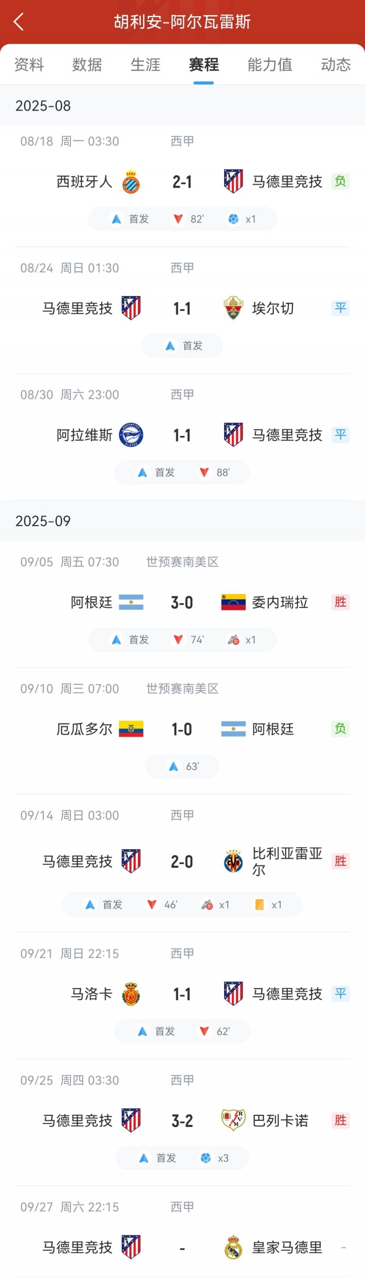 此后4场比赛阿尔瓦雷斯均颗粒无收,仅在第4轮对阵黄潜的比赛中贡献了一个助攻。此外,上轮联赛对阵马洛卡时,他罚失一个点球,最终马竞1-1与对手战平。