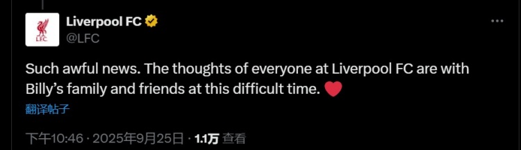 利物浦官方写道:“如此令人痛心的消息。在这个艰难时刻,利物浦足球俱乐部全体人员的心与比利的家人和朋友同在。❤️”