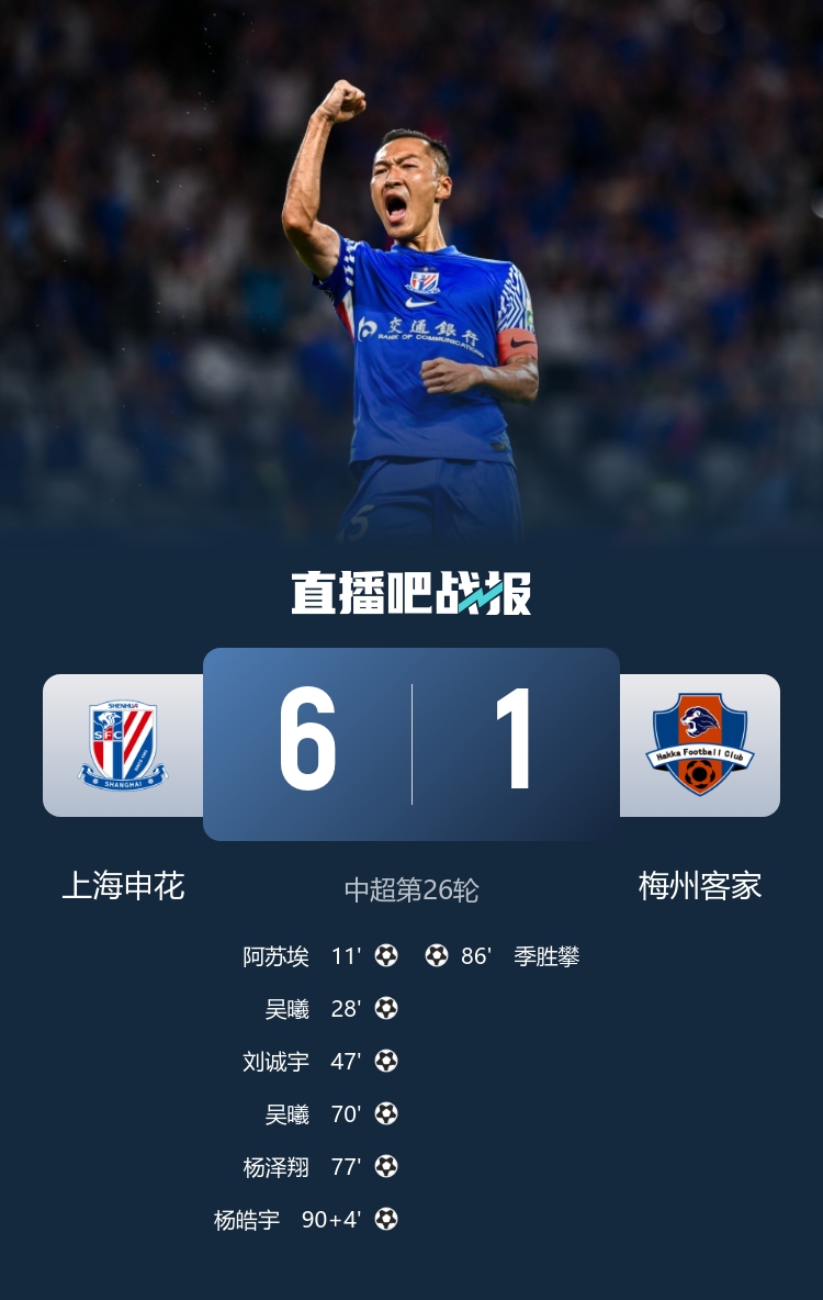 近四轮首胜!申花6-1梅州 36岁吴曦梅开二度38岁于汉超助攻双响