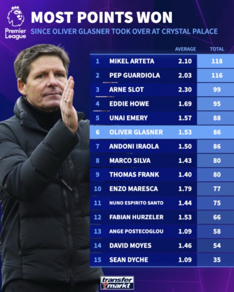 自从格拉斯纳执教水晶宫以来,球队在英超一共获得了86分,格拉斯纳的场均得到为1.53分,排在英超第六位。而且很可能在本赛季超越埃梅里,升至第五位。格拉斯纳在水晶宫的英超场均得分比前任霍奇森高出25%,他已经是英超时期水晶宫俱乐部场均得分最高的主帅。