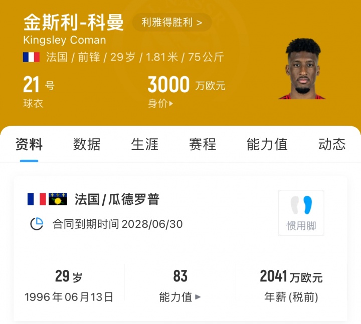 29岁的科曼现身价3000万欧,他今夏从拜仁转会至利雅得胜利,转会费仅2500万欧。据专业球员薪水网站capalogy数据,科曼在利雅得胜利的年薪为2041万欧。他本赛季已为胜利出战8场比赛,贡献了3球5助攻,场均能制造1粒进球。