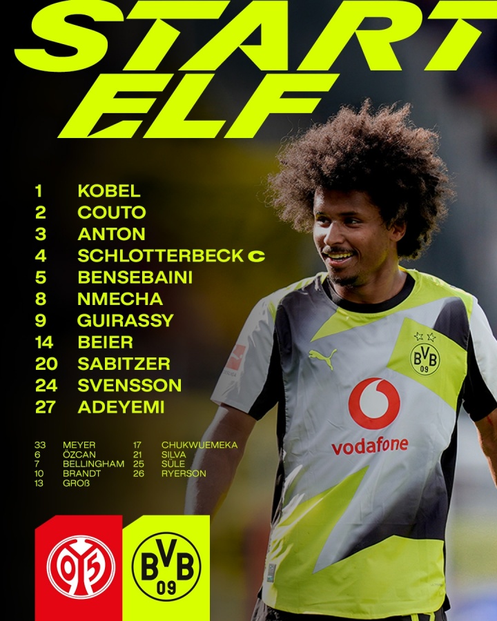09月27日讯 德甲第5轮,多特客场挑战美因茨,双方首发名单公布,本场比赛,多特今夏的标王小贝林厄姆继续替补,这已经是他连续第四场替补。