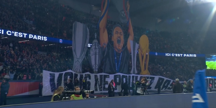 球迷展示巨型TIFO,庆祝登贝莱喜提金球奖和恩里克获颁克鲁伊夫奖