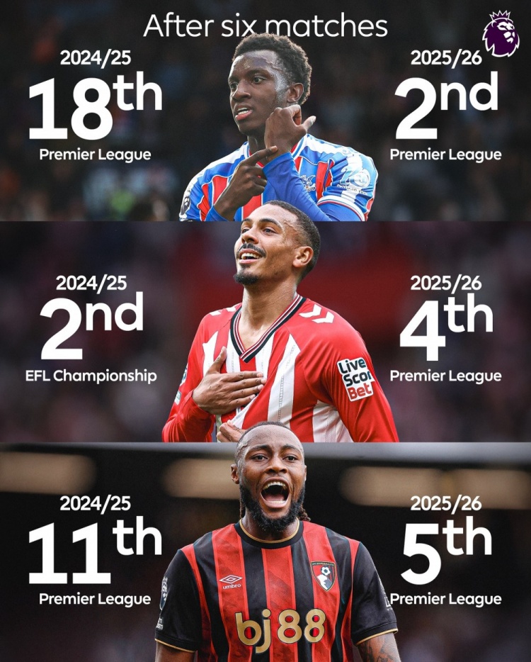 9月28日讯 英超官方更新社媒动态,称赞水晶宫、桑德兰、伯恩茅斯本赛季的表现。