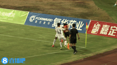 本场比赛进行到补时阶段,此时上海嘉定汇龙1-2落后广东广州豹,柏佳骏后场准备开定位球,被广东广州豹球员阻挡。