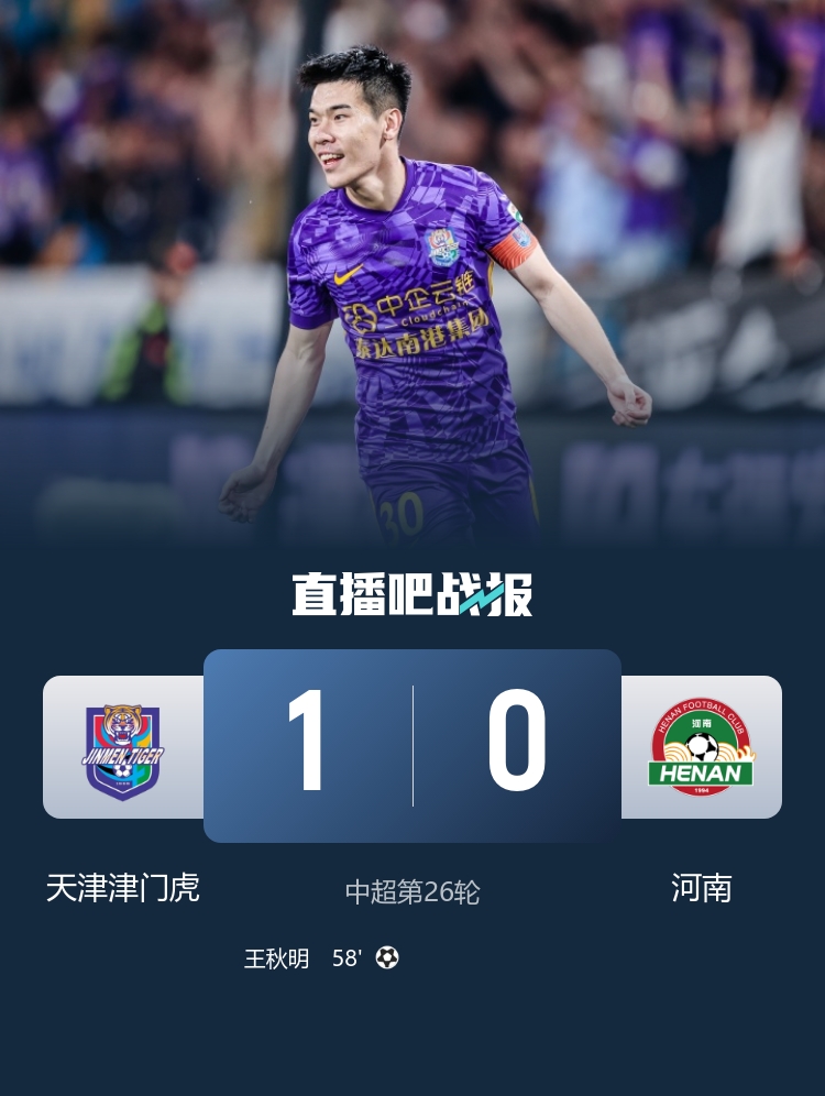 暂升中超第五!津门虎1-0河南迎三连胜,王秋明制胜球全场7人染黄