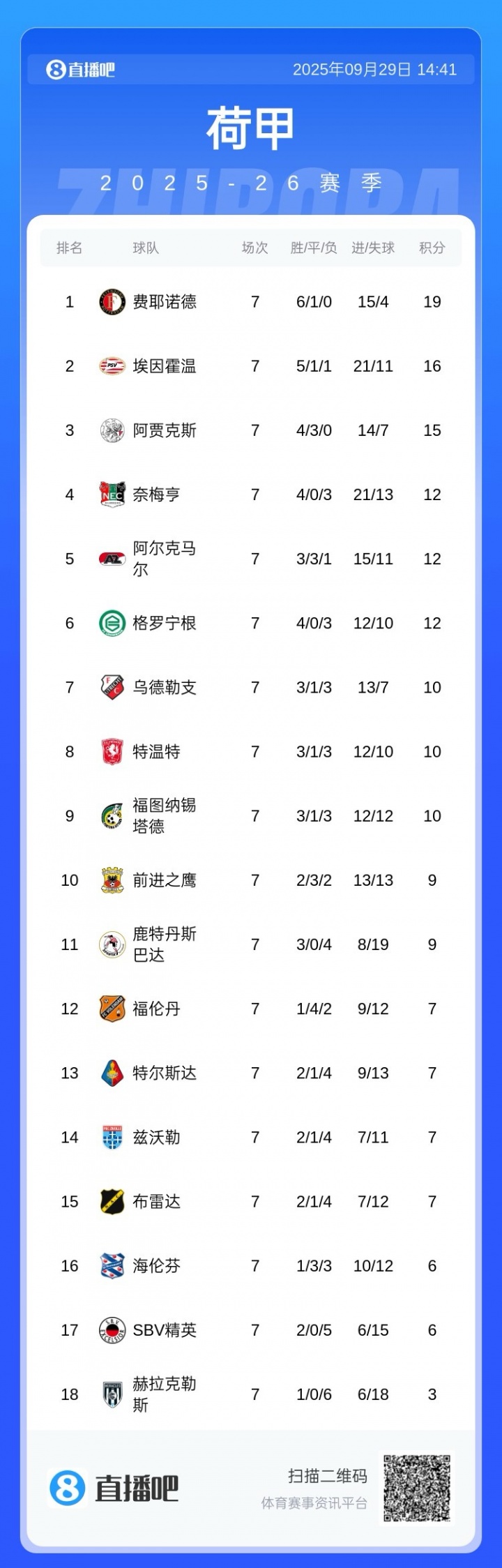 目前在荷甲积分榜上,费耶诺德7轮6胜1平,积19分以不败战绩领跑。
