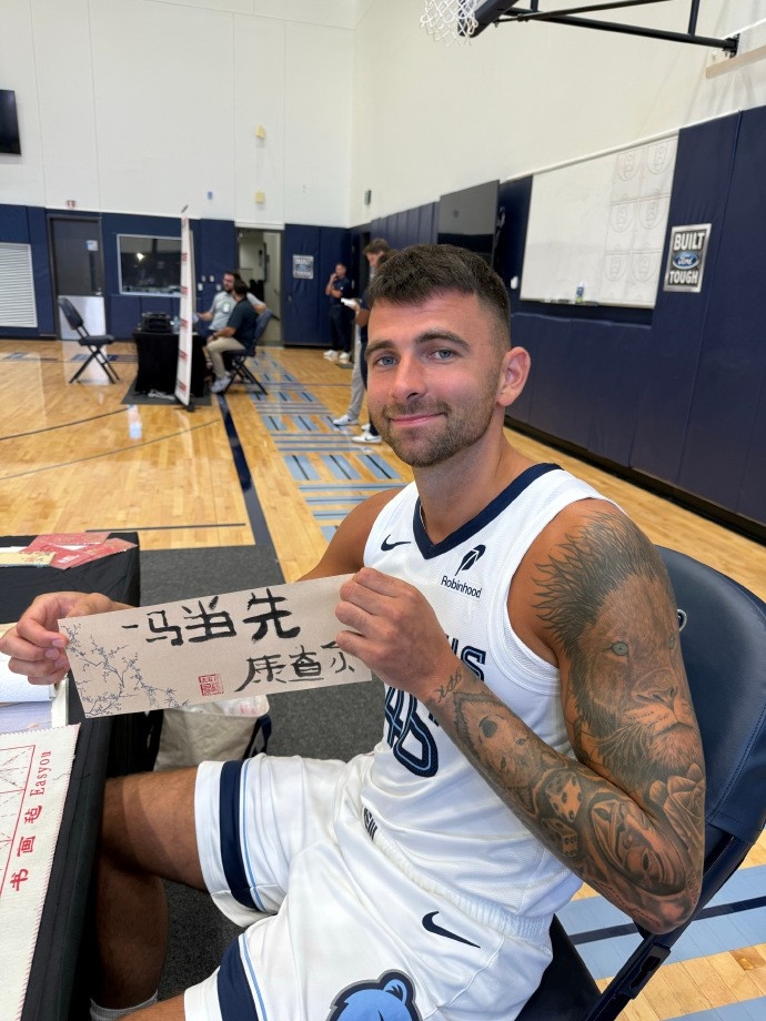 9月30日讯 灰熊新赛季媒体日,一众球员纷纷练习起中文书法。