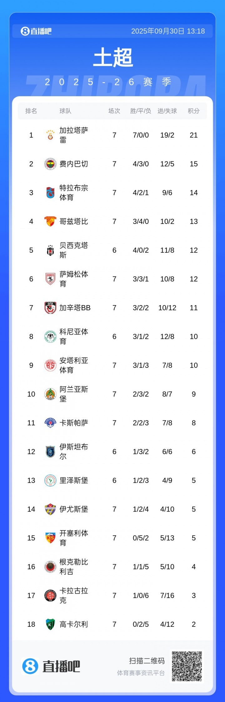 将战利物浦!加拉塔萨雷土超7场全胜,欧冠上轮惨败+18场输了12场