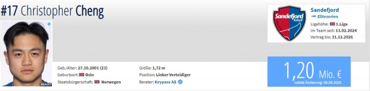 本赛季,他在挪超出场20次贡献5球3助,状态火热,德转身价已经来到了120万欧。