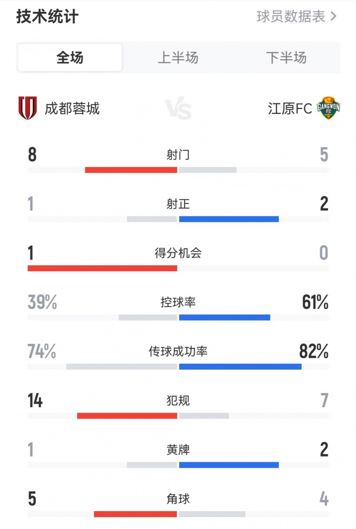 主打效率!蓉城1-0江原全场数据:蓉城控球率4成 1脚射正即破门!