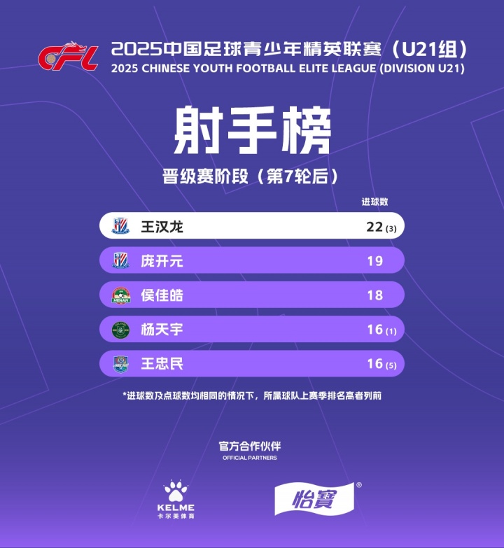 09月30日讯 2025中国足球青少年精英联赛U21组今日结束了晋级赛阶段的所有比赛,大连英博、上海申花、长春亚泰、云南玉昆、浙江、天津津门虎、深圳新鹏城、河南8支球队进入决赛阶段,申花小将王汉龙排名射手榜第一。