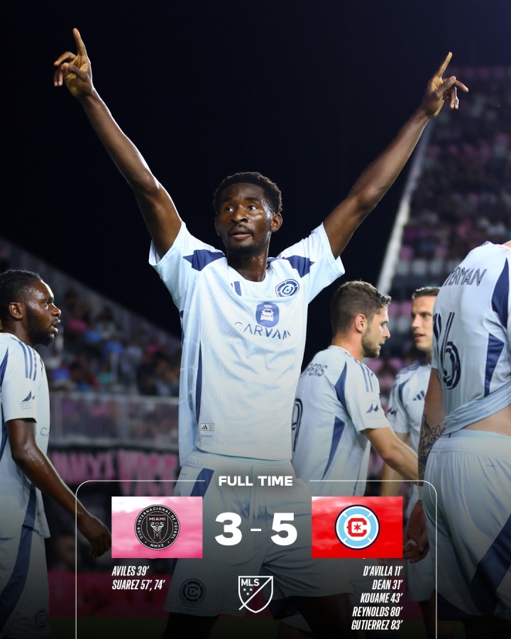 10月1日讯 北京时间10月1日07:30,美职联常规赛迈阿密国际迎战芝加哥火焰的比赛在洛克哈特体育场进行,上半场梅西任意球造险,阿维拉头球闪击首开记录,迪恩小角度推射扩大比分,阿维莱斯补射扳回一城,夸阿梅低射扩大比分,半场结束,迈阿密国际1-3芝加哥火焰。下半场梅西&阿连德中柱,苏亚雷斯双响,雷诺兹包抄破门,古铁雷斯世界波,最终迈阿密3-5芝加哥两轮不胜距榜首7分。