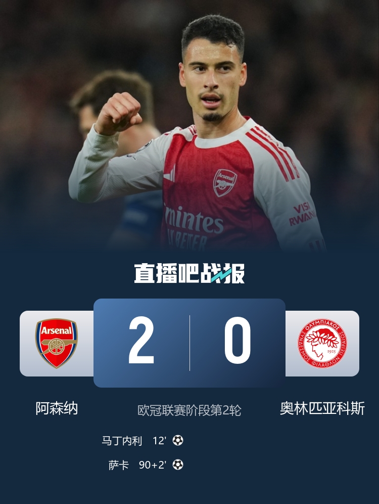 10月2日讯 北京时间10月2日凌晨3时,欧冠联赛阶段第2轮,阿森纳坐镇酋长球场迎战奥林匹亚科斯。上半场,马丁内利首开纪录,拉亚完成一次精彩扑救。阿森纳半场1-0领先奥林匹亚科斯。下半场,加布里埃尔伤退,波登斯破门但被判越位在先,萨卡替补建功。最终阿森纳2-0击败奥林匹亚科斯,迎来欧冠2连胜!
