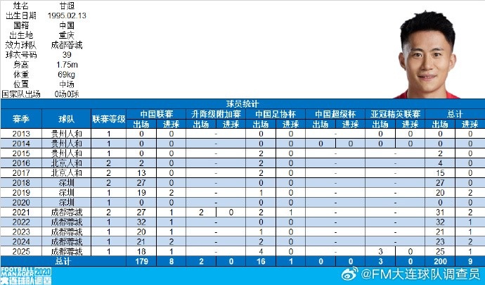 里程碑!成都蓉城中场甘超职业生涯各赛事出场200次