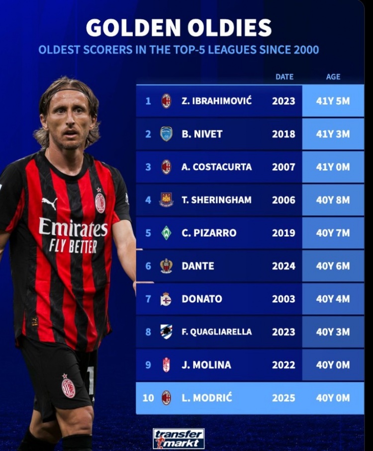 9月15日讯 意甲第3轮比赛,米兰以1-0的比分小胜博洛尼亚。本场比赛,40岁老将莫德里奇打进了全场唯一进球,克罗地亚人跻身本世纪五大联赛最年长进球者前10。