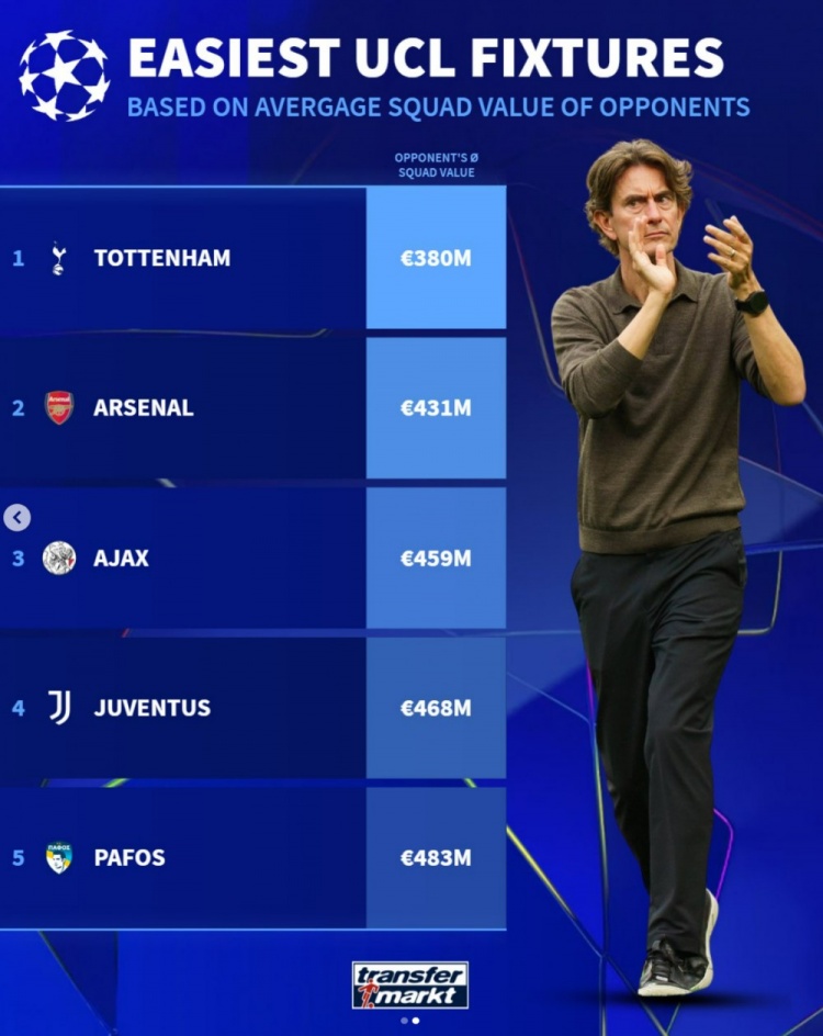 9月16日讯 本赛季欧冠即将打响,德转也根据联赛阶段对手平均身价盘点了各球队赛程难易程度,其中巴黎对手的平均身价最高,具体如下: