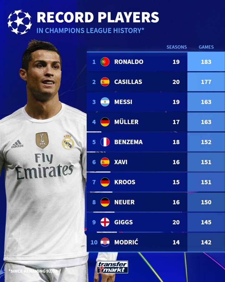 皇萨仁霸榜!欧冠历史出场榜:C罗183场居首,诺伊尔有望进入前三