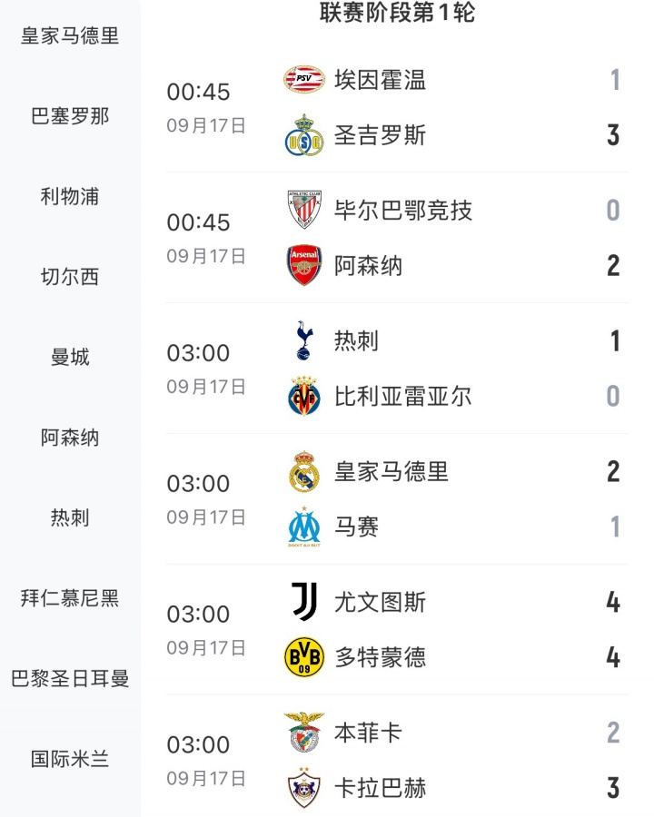9月19日讯 欧冠联赛阶段首轮比赛全部结束,巴萨2-1客胜纽卡,曼城2-0战胜那不勒斯。法兰克福5-1大胜加拉塔萨雷登顶榜首。