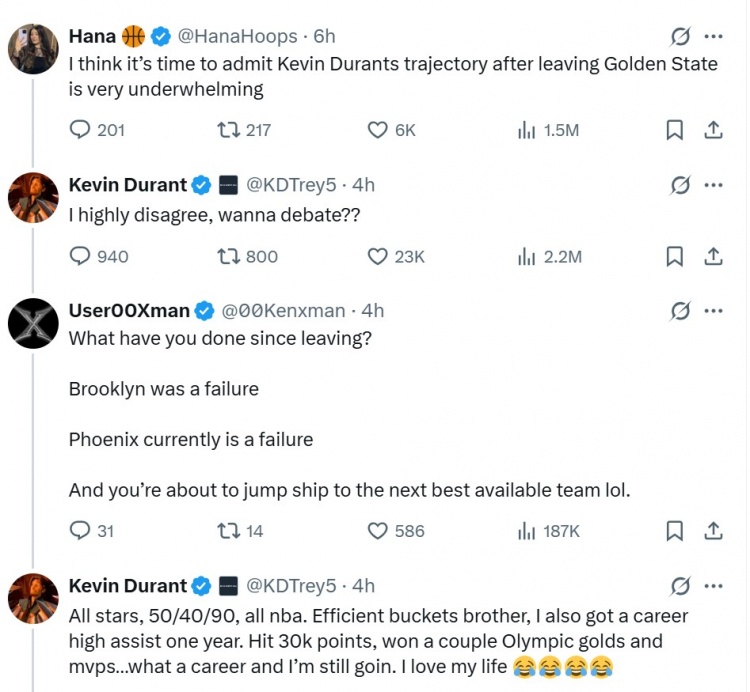 网友:我认为是时候承认,凯文-杜兰特离开金州勇士后的表现相当令人失望。