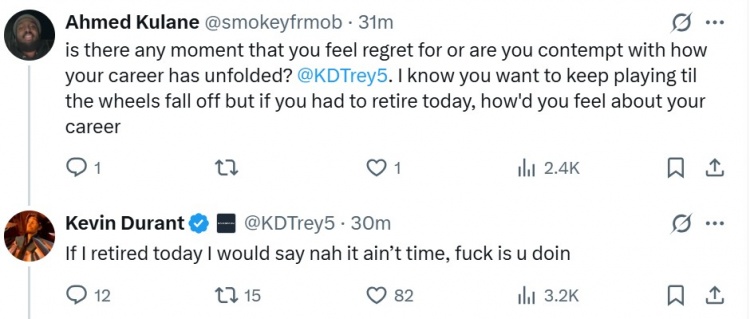 网友:有没有哪一刻让你感到后悔,或者你对自己的职业生涯感到满意吗? KD,我知道你想一直打到不能再打为止,但如果你今天不得不退役,你会怎么看待自己的职业生涯?