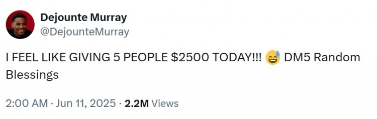 穆雷写道:“我今天我今天想给5个人每人2500美元!!! 😅 请私信我,随机送出祝福。”