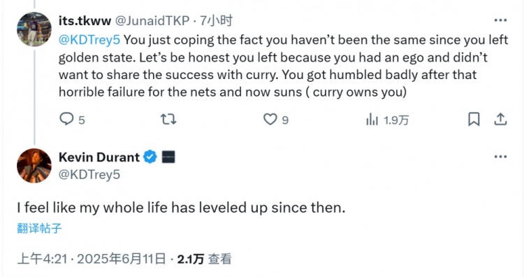 6月11日讯 今天,杜兰特在社媒和网友互动。