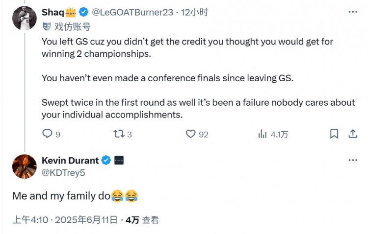 网友:没人在意你的个人成就 杜兰特:我和我的家人在意😂😂