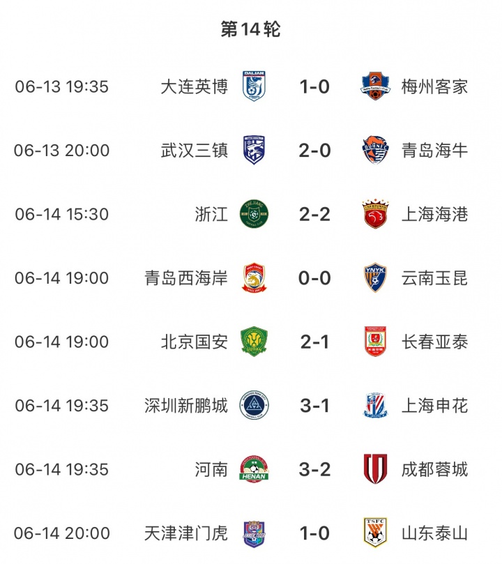 06月14日讯 中超第14轮全部战罢,海港2-2遭浙江读秒绝平,痛失好局。泰山0-1不敌津门虎,近7轮中超仅1胜。