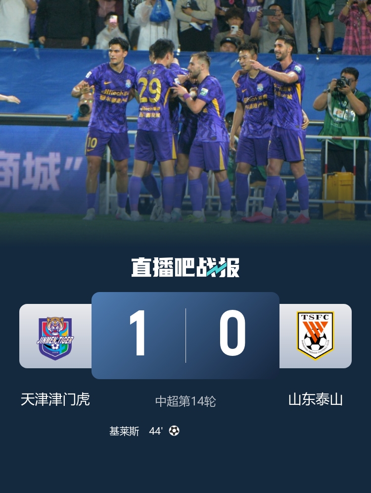 北京时间6月14日晚20时整,2025赛季中超第14轮在天津泰达足球场展开角逐,山东泰山客场对阵天津津门虎。上半场刘洋失空门,基莱斯精彩个人秀破门+联赛第10球领跑射手榜,下半场阿代米中框,刘洋手球送点,王大雷扑点难救主。最终天津津门虎主场1-0战胜山东泰山,津门虎近6年首胜泰山。积分榜方面,津门虎积22分升至第5,泰山积21分下降至第6。