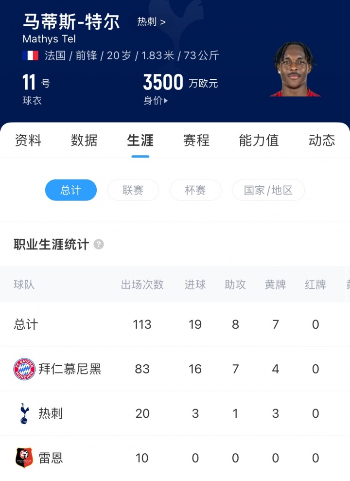 20岁的特尔与拜仁合同至2029年6月,租借效力热刺期间球员20场3球1助攻,目前德转身价3500万欧。