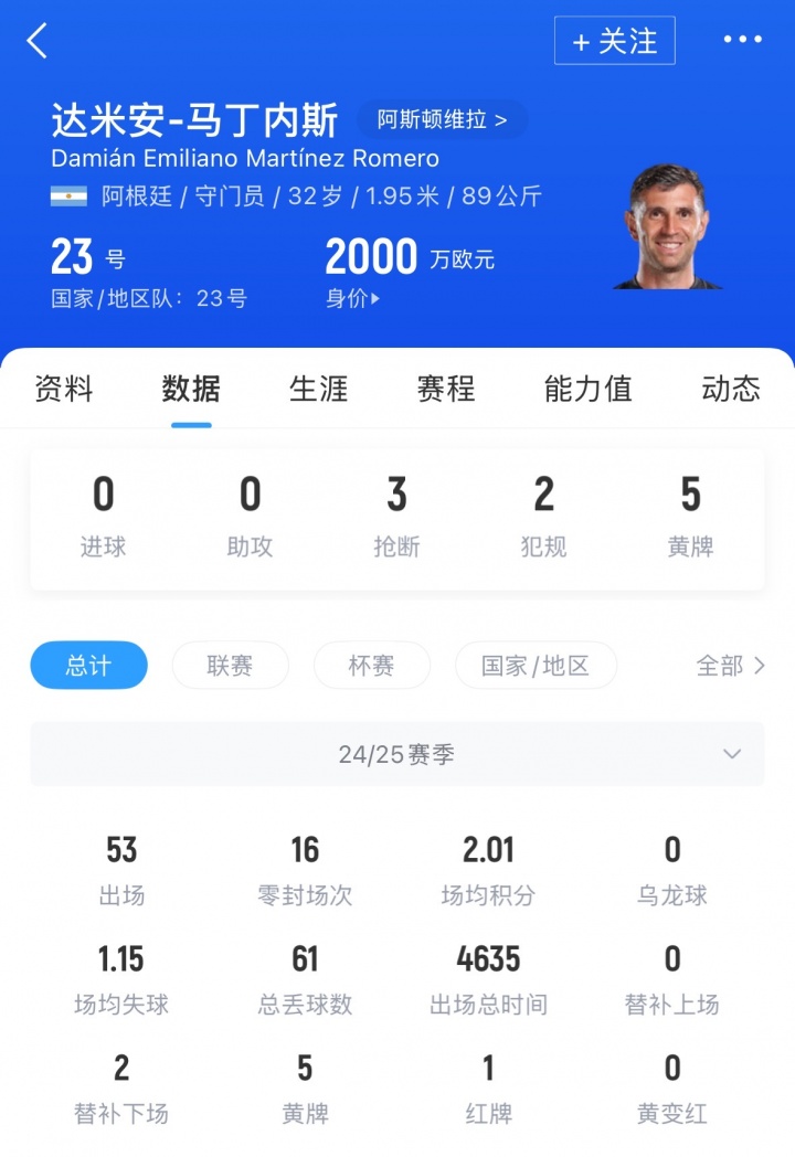 大马丁现年32岁,本赛季为维拉出场53次,共16场零封,目前球员德转身价为2000万欧元。