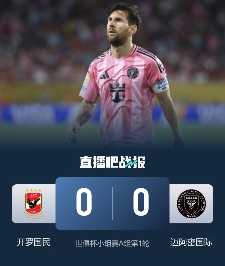 6月15日讯 北京时间6月15日早8时整,2025年世俱杯揭幕战小组赛A组第1轮在硬石体育场展开角逐,迈阿密国际对阵开罗国民。上半场38岁门将乌斯塔里扑点+贡献6次扑救,下半场梅西补时中框险绝杀+屡造威胁。最终迈阿密国际0-0战平开罗国民,双方各取1分。迈阿密下轮将对阵波尔图,开罗国民将迎战帕尔梅拉斯。