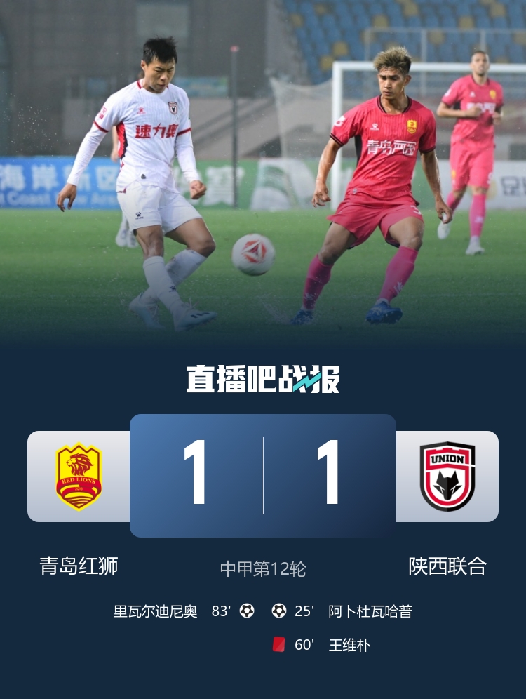 第82分钟,诺布雷加左路挑传门前,小里瓦尔多头球扳平比分,青岛红狮1-1陕西联合。↓